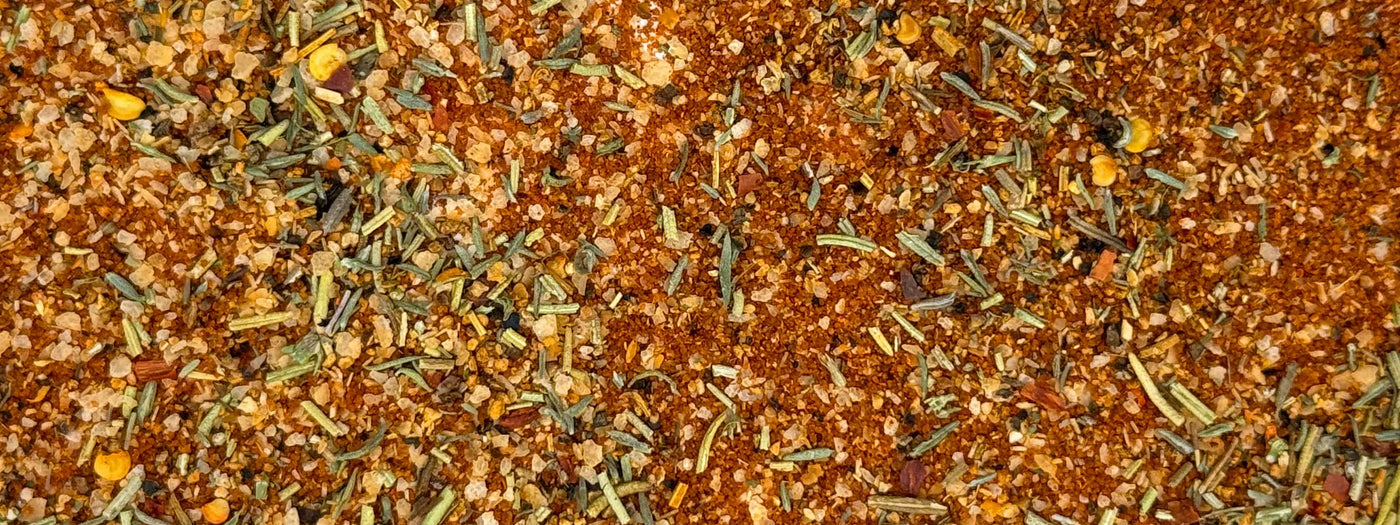 Kosher Salt, Brown Sugar, Smoked Paprika, Black Pepper, Thyme, Rosemary, Garlic Powder, Onion Powder, Sage, Cayenne Pepper, Coriander, Crushed Red Peppers, Ancho Chili